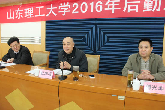 校党委常委、副校长杜瑞成在会上发表讲话。他代表学校向辛勤工作在后勤战线上的每一位员工表示亲切的问候和衷心的感谢。他对后勤求实、团结的领导班子,服务意识和奉献意识不断增强的后勤员工,不断提高的后勤服务质量和管理水平,不断强化的后勤服务保障功能等方面给予了充分肯定并就学校2016年后勤具体工作做了动员和部署。