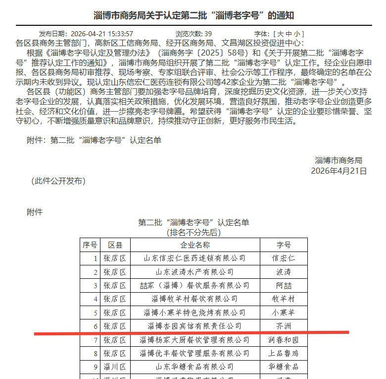 近日,淄博市商务局公布第二批淄博老字号认定名单,我校山东理工大学淄博杏园宾馆有限责任公司成功获评。宾馆历经四十余年稳健经营,凭借深厚的品牌底蕴、优质稳定的服务与良好社会口碑,荣获 “淄博老字号” 称号,成为全市住宿餐饮服务行业传承创新、稳步发展谋旮说浞丁�